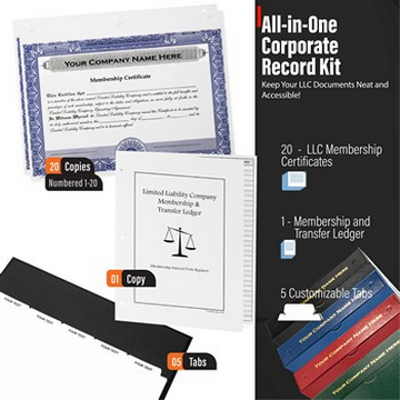 The LLC Business Kit provides everything you need to professionally organize and maintain your limited liability company records. Each kit includes a high-quality 3-ring binder with matching slipcase, printed Operating Agreement templates, numbered stock (membership) certificates with detachable stubs, and customizable index tabs. Designed for long-term durability, this record book ensures your LLC’s essential documents—such as meeting minutes, ownership records, and agreements—stay compliant and organized. Perfect for law offices, accountants, and business owners who value professionalism and precision.